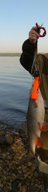 К сожалению ни садка ни кукана с собой не было, пришлось из машины достать верёвку и через жабры её пропустив , отправил жору в воду .
