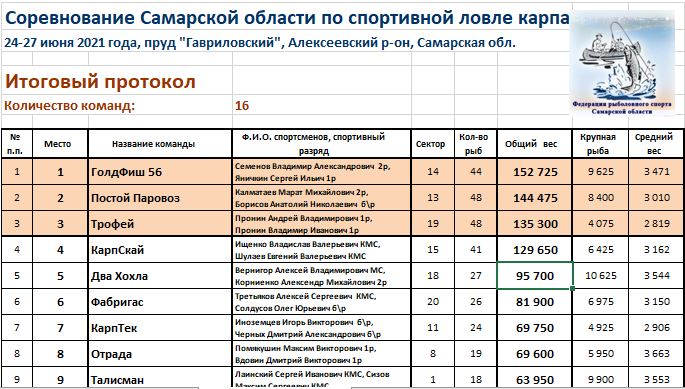 итоговый протокол Соревнований Самарской области (ловля карпа-парные) 24-27 июня 2021