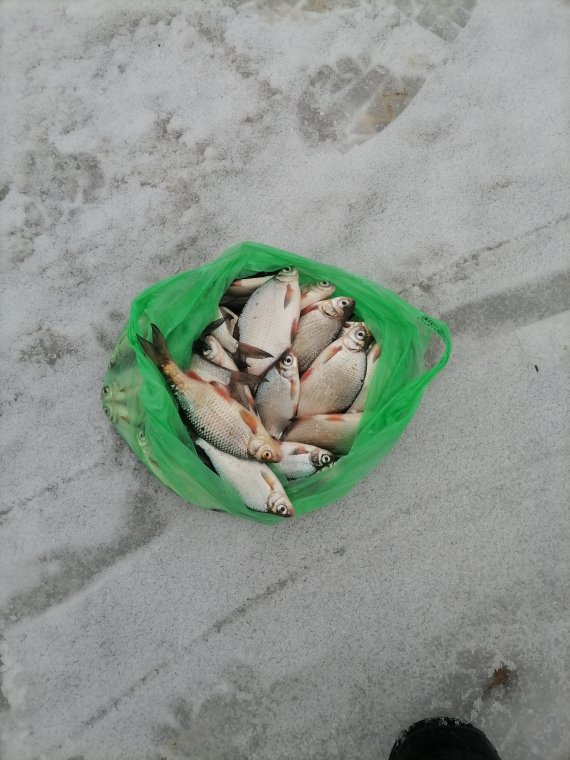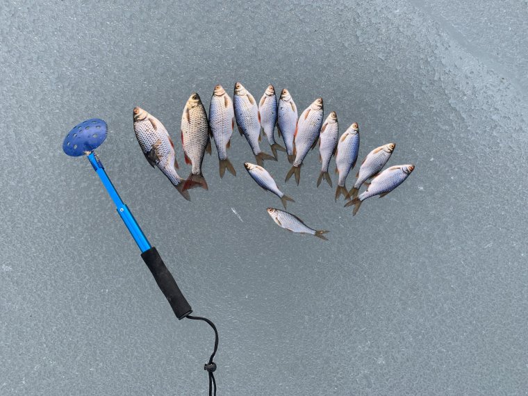 И опять на бутерброд и чаще и крупнее на крючок. Был один очень-очень крупный сход. Попёрла так, что пришлось леску с катушки сдавать. Благо на небольших глубинах ловлю с открытым тормозом. Обрыва избежал, но сошла. Даже не видел кто. Ещё доставали постоянные зацепы за лёд свободным крючком/мормышкой при вываживании рыбы. Спасала рогулька.