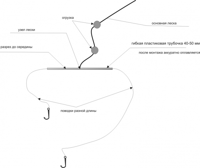 Сам всю зиму думал, как сделать. Решил воспользоваться опытом ... фидерной оснастки. на основной леске сделал петельку, потом закрутил две лески пальцами в одну сторону - получился относительно жесткий отвод, потом снова узел. На конце основной лески еще петля. В петли поводки из более тонкой лески. Основное, самое тяжелое грузило выше отвода. Подпаски ниже. В результате имеем один крючек классически на дне, второй в стороне в свободном полете. Об этом шла речь?