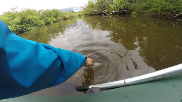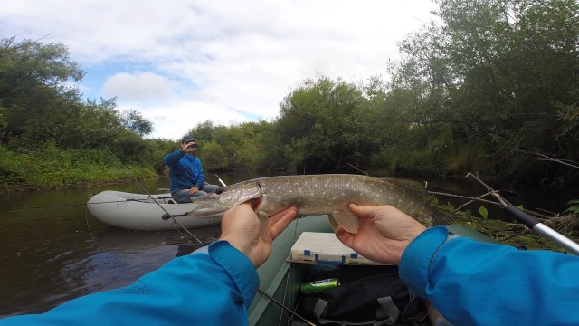 Поймать в быстрой харюзовой речке вроде бы привычных нам щуку, окуня, язя, не так уж просто. Если не ошибаюсь, мы серьёзно обловили конкурентов, то и дело полощащих снасти в поисках хоть какой-то рыбы. Пара заливчиков, немногочисленные затишки, коряжки.