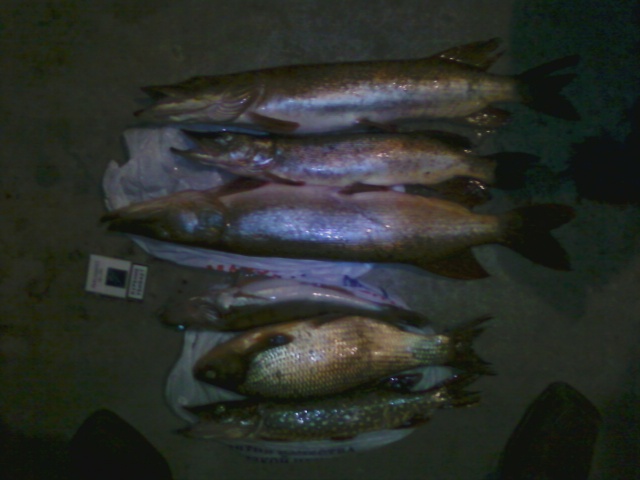 У меня - щучка ушла, так на глаз около 2.5 кило. Потом - взял шнурка-переростка, он за жабры зацепился, пришлось оставить... Потом... Потом поклев и удочка в дугу, и язь в итоге на полтора кило. Потом - у брата щучка... Не взвешивали, но померили рулеткой на берегу: язь 44 см, щучка самая большая - 76 см. Ловили на кранки, у меня серебристый, у брата "красная бошка". Под занавес у меня взял судачёк, грамм 700. Впрочем, лучше наверное фотки расскажут (три верхних щуки - улов брата):