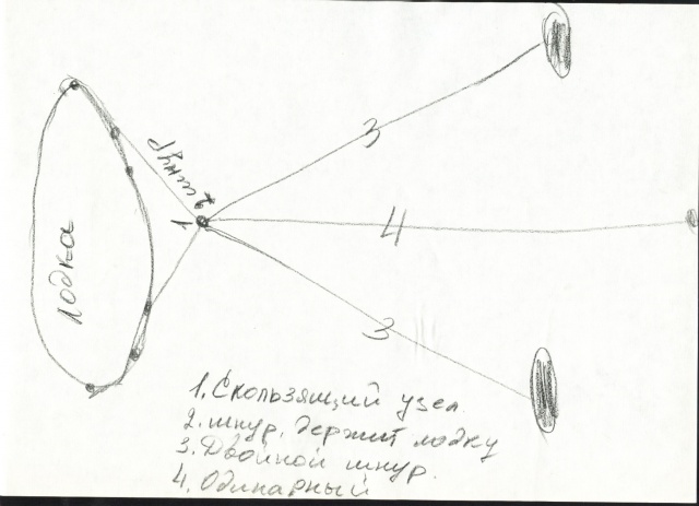 Ты сбрось один груз отплыви от него на метров 20 и бросай-другой так что бы груза были параллельно .Потом натягивай шнуры.Лодка получится по середине