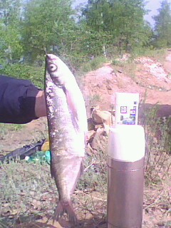 Шучу!!! Приехали поздно около 10, но к этому времени у одного из немногих стоящих на резинку было в садке 1-2 кг чего-то серебристого (зрение у меня не ахти...). Завёз груз, течение бешенное, 2л баклажка почти сразу скрылась под водой
