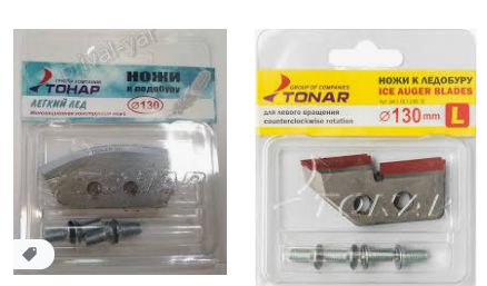 Универсальные или плоские ножи. Таких ножей большое множество от разных производителей. Отличие моделей заключается в размере угла между двумя режущими поверхностями. Чем этот угол ближе к 90 градусам, тем больше такие ножи соответствуют сверлению мягкого льда. Уменьшая угол, ножи агрессивнее режут твердый лёд в мороз. Но край острого угла и более ломкий при резком опускании на лёд или попадании в твердую инородную прослойку льда (ветки, камушки)...Ступенчатые ножи рекомендуются для холодной погоды и твёрдого сухого льда. С понижением температуры ниже -15С свойства ледового покрова меняются, как раз в это время вам помогут ступенчатые ножи, они легко решают поставленные задачи. Кроша твердый лёд, быстро проходят до воды. При более тёплых температурах, к сожалению, они не так эффективны....Зубчатые или, как их ещё называют, ножи «Зверь» для ледобура – интересна эта модель тем, что её можно сделать из уже бывшего в употреблении плоского ножа. Для этого нужно пропилить «зубчатые» бороздки поперёк режущей поверхности. Зубастики на практике хорошо себя показали на реке с песчаными наносами во льду....Полукруглые ножи для ледобура пользуются особой популярностью у рыболовов любителей. Они созданы для тех, кто ходит на рыбалку и в мороз, и в оттепель. Бур с полукруглыми ножами даёт меньшую нагрузку на руки при сверлении. Ножи отечественного производства имеют одинаковые межцентровые расстояния посадочных отверстий и поэтому ножи для ледобура Тонар 130 мм так же подойдут к ледобуру Неро 130 мм. Преимущество полукруглых ножей с маркировкой «мокрый лёд» проявляются на мокром, просто брызжущем влагой весенним покрытием водоёмов. Вгрызаясь в верхний наст, они легко проходят влажный лёд.