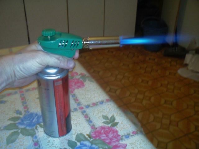 Да обыкновенная зажигалка. Откручиваешь сверху барашек на нужную подачу и нажимаешь указательным пальцем. Чик - и пламя, опять же верхним барашком регулируешь струю огня.