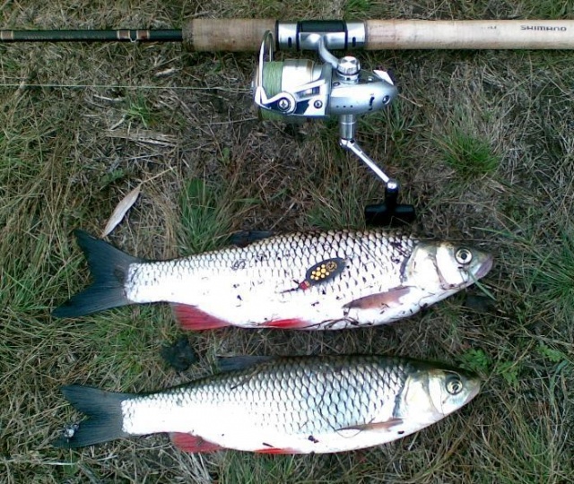 Приветствую всех!!!В субботу утром, оправившись от отмеченного накануне дня рождения VoFFki, отправились на роыбалку. При первом же забросе клюнул "карандашик" грамм на 100, был отпущен за мамкой с папкой. Далее бродили с Димедролом вдоль берега и пытались что-нибудь поймать. Порядочно пройдя вниз по течению, остановились на перекур, вдруг заметили, что на воде кто-то гоняет малька. Сначала подумали что окунь, но приглядевшись поняли что не он. Вешаю Мепс Блэк Фурия №3, первый же заброс, и на крутой берег вытащен голавль. Весь кайф поимки заключался в том, что заброс был сделан с берега высотой 10-15 м., и тащить на такую высоту полукилограмового голавлика - кайф ещё тот!!! Спускаюсь ниже, пару забросов - и ещё один на берегу. Продолжали потом кидать ещё около часа, но поклёвок больше не было - наверно мы его испугали, когда спустились ниже к воде, хотя всплески (хоть и не с такой интенсивностью) продолжались. Итог - на фото.Дальше ловить не стал, так как в 12-00 надо было уезжать, но всё равно доволен - голавля на спин ловил первый раз в соей жизни, впечатлений масса.Всем удачи!!!P/S/ Кроме нас с Димедролом остальные тоже рыбачили (несмотря на скептическое отношение некоторых участников форума), мож хоть кто ещё отчёт выложит, а то я уехал раньше и про уловы остальных не знаю ничего. Ну или хотя бы фотки кто-нибудь пришлите...