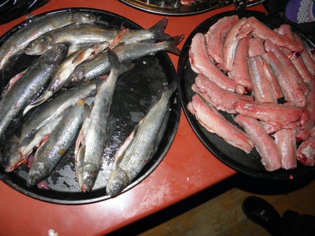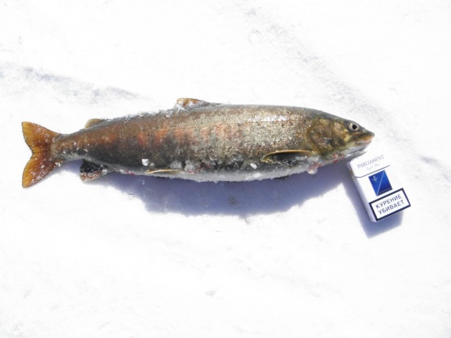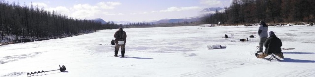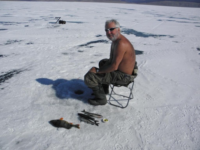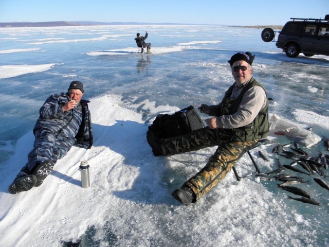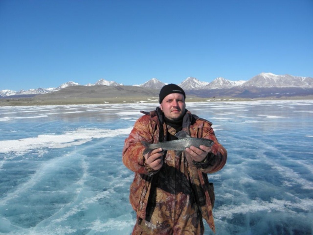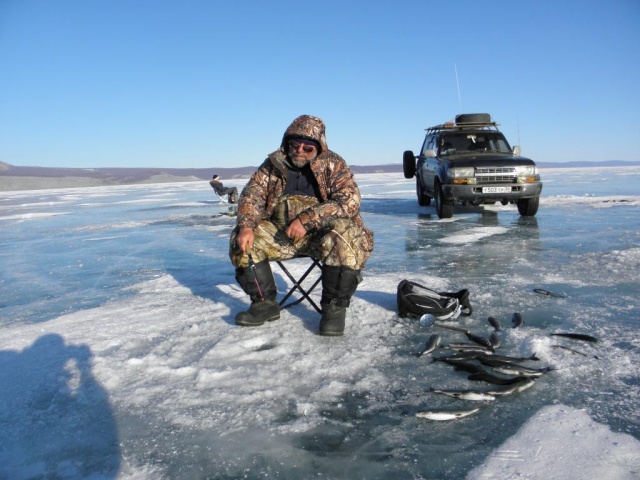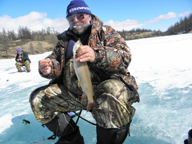 28 марта трансфером через Москву бригадой 10 человек полетели в славный город Иркутск, где нас встречали два "люксовых" внедорожника: родная "буханка" и старенькая toyota lc80 без амортизаторов. После восьмичасового путешествия через перевалы, мимо Байкала мы преодолели 340км до границы. Пролетели таможню за полтора часа, по сравнению с Казахской небо и земля, все вежливые такие, мне понравилось. Работают они с понедельника по пятницу с 8:00, до 17:00, всё остальное время граница на замке. Проехали еще 10 км и вот он легендарный Хубсугул со своими горами и прозрачным синим льдом. Разместились на базе "Край земли", там нас встретили очень гостеприимно. По приезду погода очень обрадовала, было +10 и приятно припекало солнышко. На след. утро погода резко поменялась, проснулись из-за сильного гула ветра, за окном всё бело. Зима приехала за нами. Позавтрокав, уселись в наши «комфортные» авто и двинулись ловить хариуса. Клёв был хороший, ловили на кислотные мормышки и мушки с подсадкой опарыша. В первый день рыбалки какая-то жадная рыба украла удочку, ладно запас был хороший, особо не расстроился. Общий улов за день составил 4 мешка хариуса на10 человек. По прибытию на базу достали из него икру, засолили и с удовольствием скушали под водочку. На след. день погода была намного лучше, поехали на ленковое озеро, лёгкий морозец, яркое солнышко, вокруг горы…..Красотища… За весь день поймали 75 ленков (сибирская форель) на 10 человек. Из-за морозов крупная рыба не клевала, самый крупны ленок был не более 1кг. На третий день интерес к рыбалке стал угасать, одна и та же рыба, одни и те же снасти, всё одно и то же… ни какой перспективы. Были единичные случаи поимки окуня, достали только двух, другие не лезли в лунку (бур на 150). На четвёртый день очень сильно захотелось домой, рыбалка была уже не радость, а каторжанский труд. Ни рыбу, ни икру с Монголии вывозить нельзя, карантин. Есть её сил уже не было. В последний день пребывания на рыбалку не поехал, сильно обгорело лицо и руки, отдыхал на базе и собирал вещи.