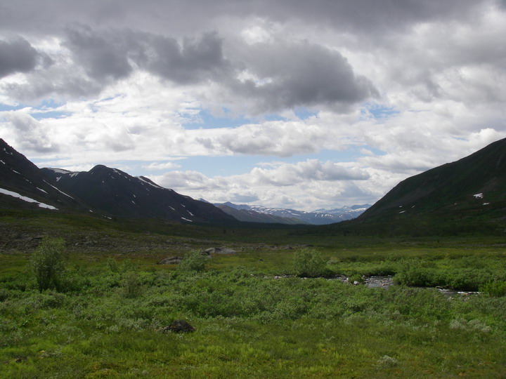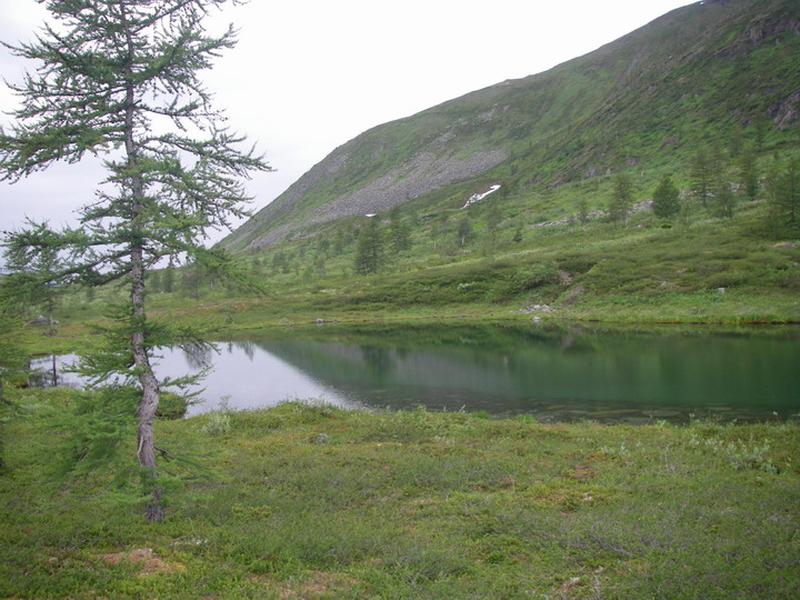 Спуск с Народы. Поднимались по одному из гребней, по снежнику. Спускались в этом месте по берегу ручья, в низине. Вверху видим три крошечных фигуры, идущие вдоль снежника, и именно в этот момент явно размышляющие, не пойти ли по снегу. Рукомахально объясняем им, что туда надо по снегу, обратно по низу. На том же языке отвечают, что всё поняли, благодарят, и обещают прислать сто баксов.