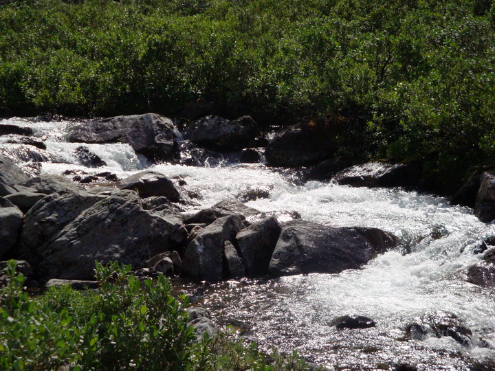 Так и дотопали, с хоровым хлюпаньем и моим сольным сухим скрипом, до впадения в Манарагу ручья Олений. Воды по колено. И что я всё скриплю, когда все хлюпают? Вперёооод! Дальше хлюпали единым хором.