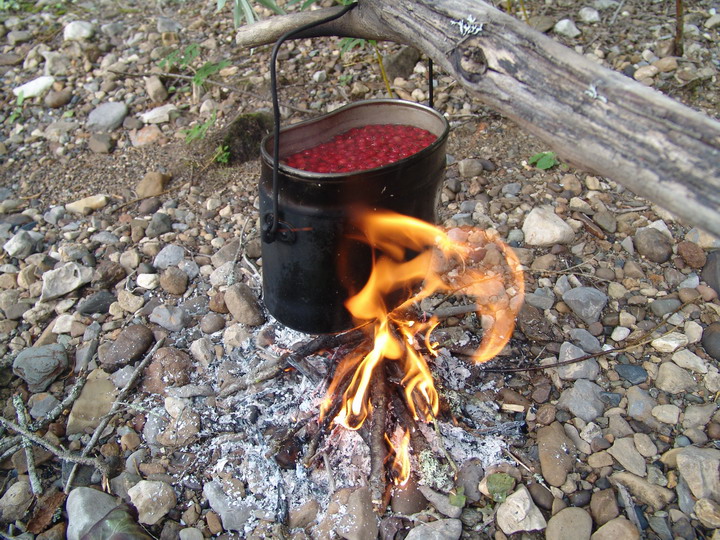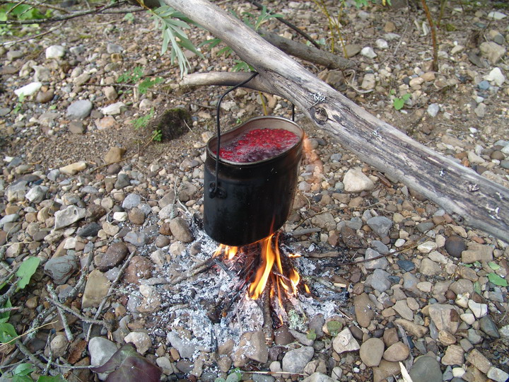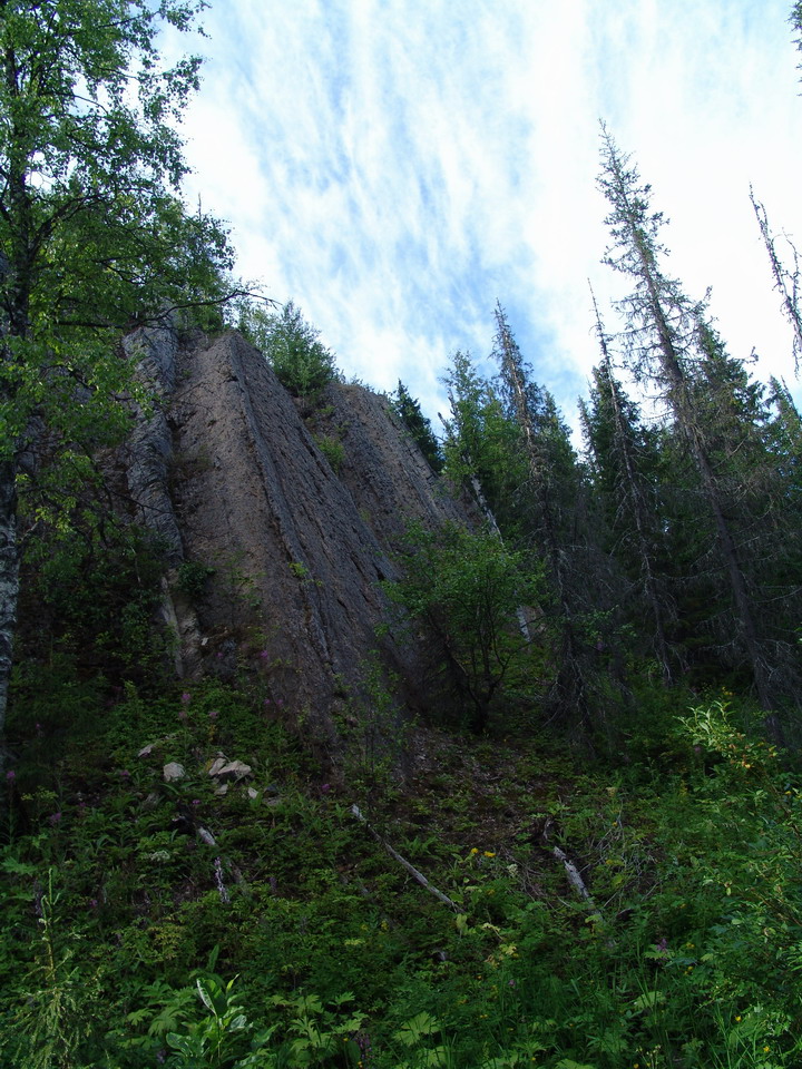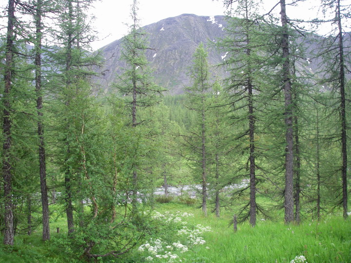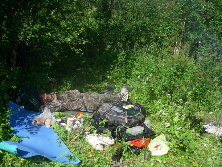 Огромная лиственница. Сушилка на нижних ветвях, даже при дожде вода туда не просачивалась. В лагере огромная яма консервных банок. Лом, бочки, фляги, ещё какие-то железки. Кто-то долго там находился, причём с какими-то нетуристическими целями. Туристы тоже явно здесь злодействовали, пеньков от молодых берёзок, скошенных для сборки катамаранов, рядом с лагерем полным полно.