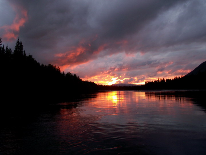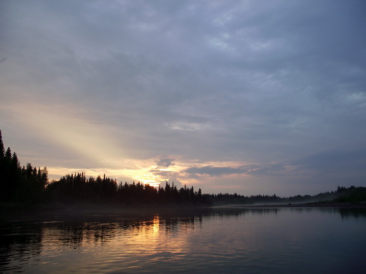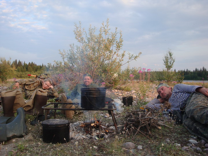 Пытались выследить Капкан-Вож. Так и не пойму, остановились мы выше него, или ниже. Увидели затишок слева, и сразу занырнули в него. Поднялись на высокий берег, где оказалось неплохое место для лагеря. Очень даже неплохое. И дров, просто завались. А какой был закат!