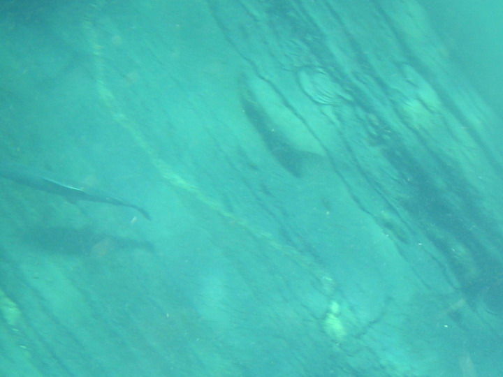Иной раз глубиной метров десять! При супер-видимости. На дне всё просматривалось. Рыба в том числе. Вот одна всё же попала в кадр.