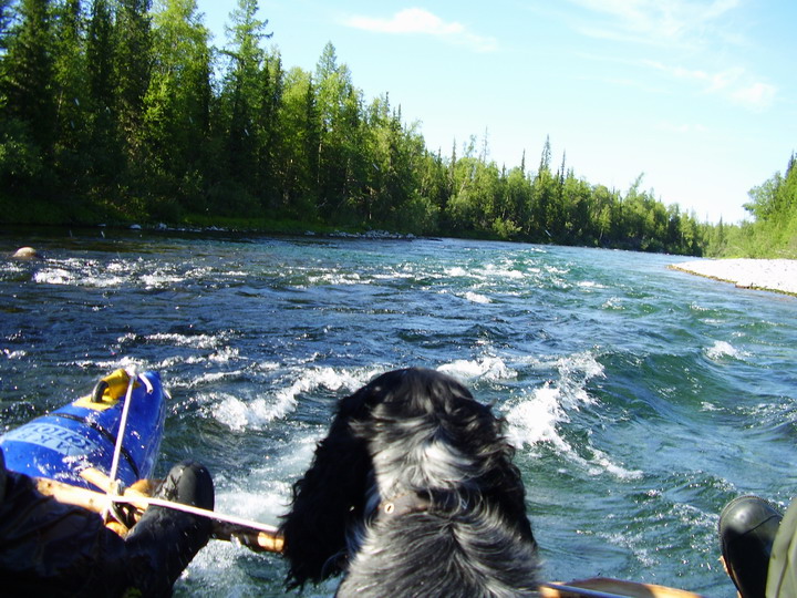 Снежники ему полюбились, такие кувыркания устраивал, животики надрывались. На катамаране все волны доставались ему, а в серьёзных местах страховали его за шкирку. Причём большинство волн не просто плескались, а перекатывались через него, не оставляя сухого места на псине. У костра греться не очень любит, почему-то.