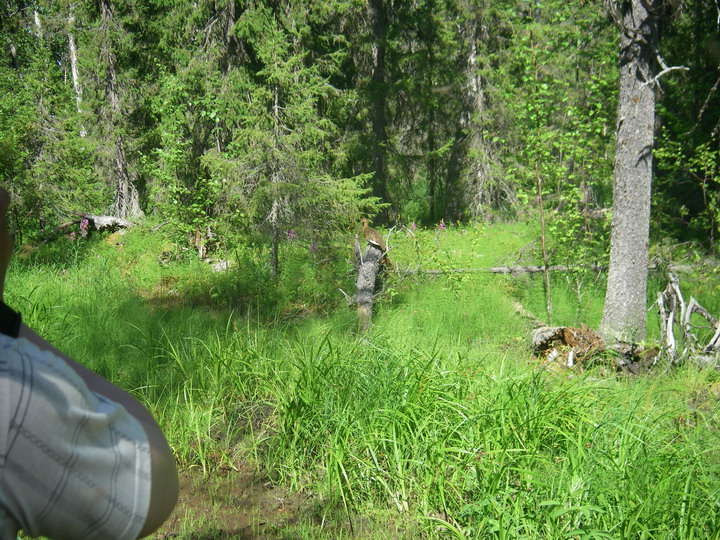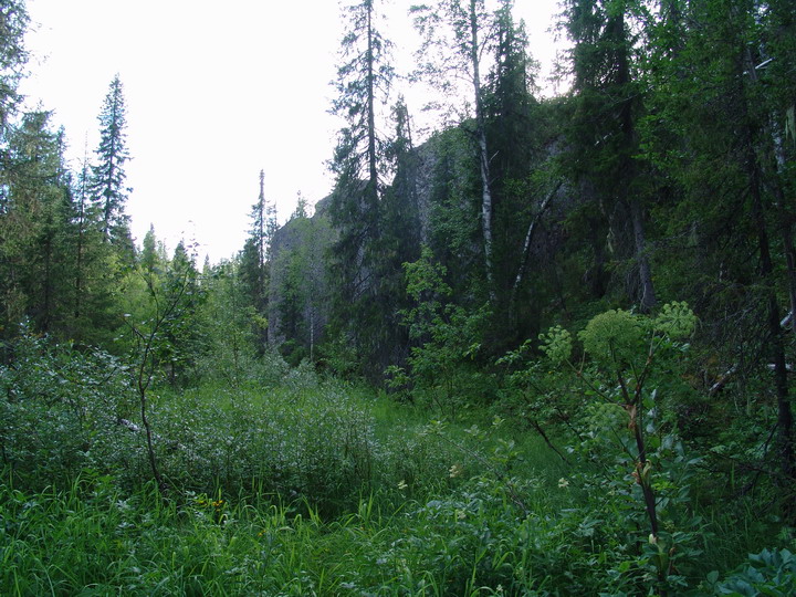 Перейдя ручей, поснимали сапоги, и, пошли преодолевать болото в обуви полегче. Все кроме меня мигом начерпали воды в кроссовки. А мои трекинговые ботинки, ранее блестяще поддерживавшие стопу даже при хождении по остриям валунов, отличились и в борьбе с сыростью. Вода в них могла попасть, лишь залившись через верх. Сами по себе они совершенно не промокаемы.