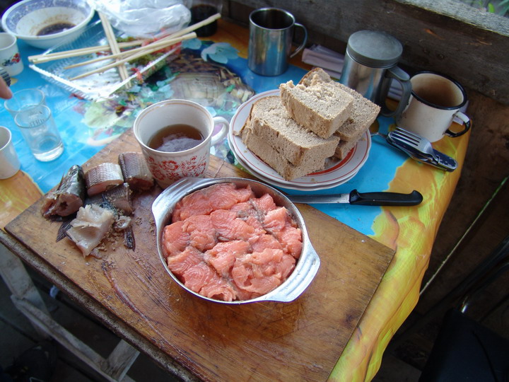 Ещё в первый уловистый день часть рыбы была подсолена. И забыта. В поезде о ней вспомнили. Попробовали, и местные жители вынесли вердикт, что она несъедобна в силу пересоленности. Не знаю, мне, так в самый раз, намного менее солёная, чем наша солёная рыба, хотя и более солёная, чем малосол из хариуса. К пиву – самое то!