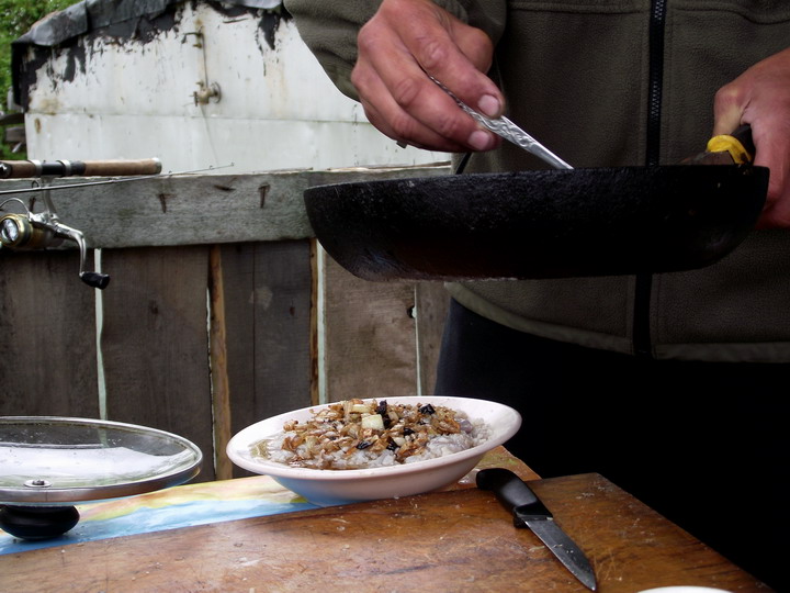 В облаке я находился в нескольких слоях одежды. Но там ничего не спасает, промокает всё, и ты оказываешься в толстом слое сырости, который прогреть не в состоянии, даже если активно двигаешься. В последующие дни, когда вялый но настойчивый дождик орошал и высокую траву, и деревья, через которые мы шли, моя новая коллекция одежды «лето-2011» показала себя с лучшей стороны. Не глядя на температуру я одевал легчайшую ветровку и такие же штаны, которые обычно хорошо защищают от солнца в жару, когда надоедает обгорать. Всё это мигом промокало, но при ходьбе тонкий слой влаги на мне быстро нагревался, и холодно не было, пока не остановишься.