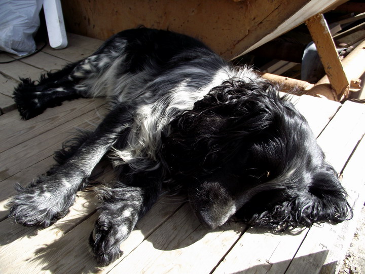 Рэй снова мокрый. С перевала, наверное не просыхал, алкаш. Вот уж кто натерпелся! Мы-то хоть знаем, куда лезем, для чего. Ну, или думаем, что знаем. Но он-то, бедный, что думает о всём творящемся? В горы… Чудом лапы не стёр о камни.