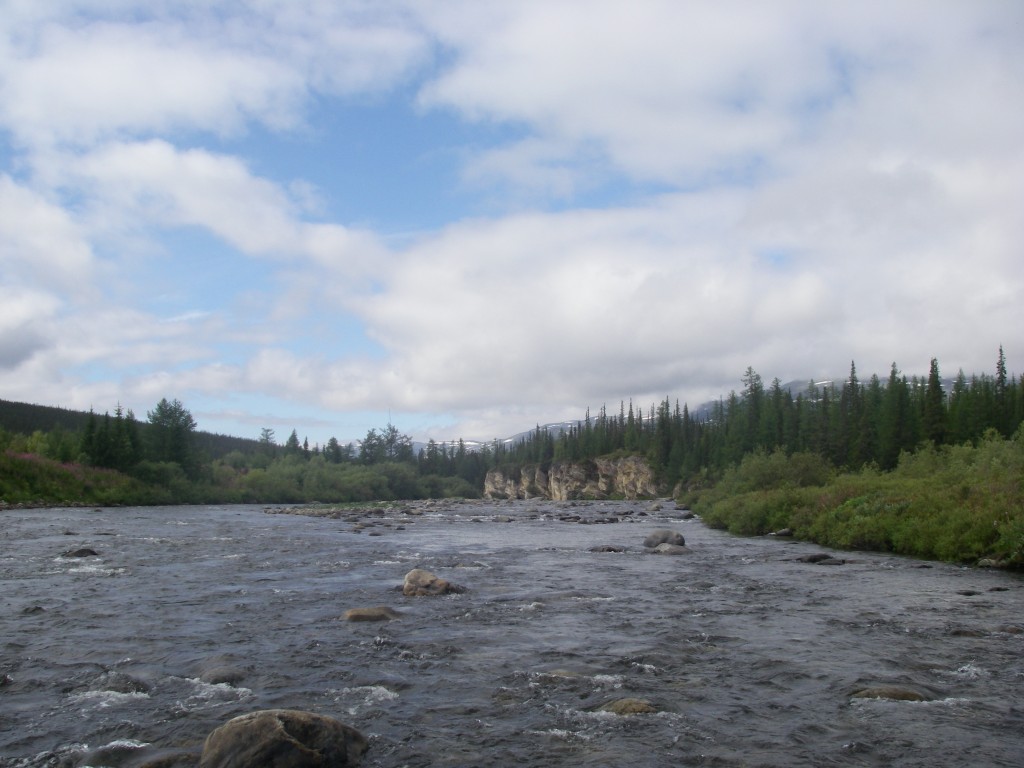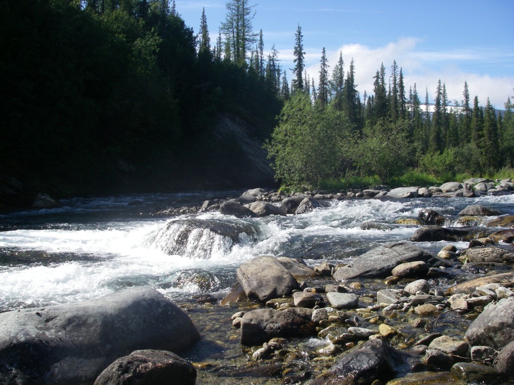 Дошли до устья БалбаньЮ, где река впадает в Кожым. Впали. Где-то чуть ниже должно быть препятствие неслабой категории сложности, прижим Манюку. Где он? Да вот он! Да гдее..?? Да вот!! Да где...
