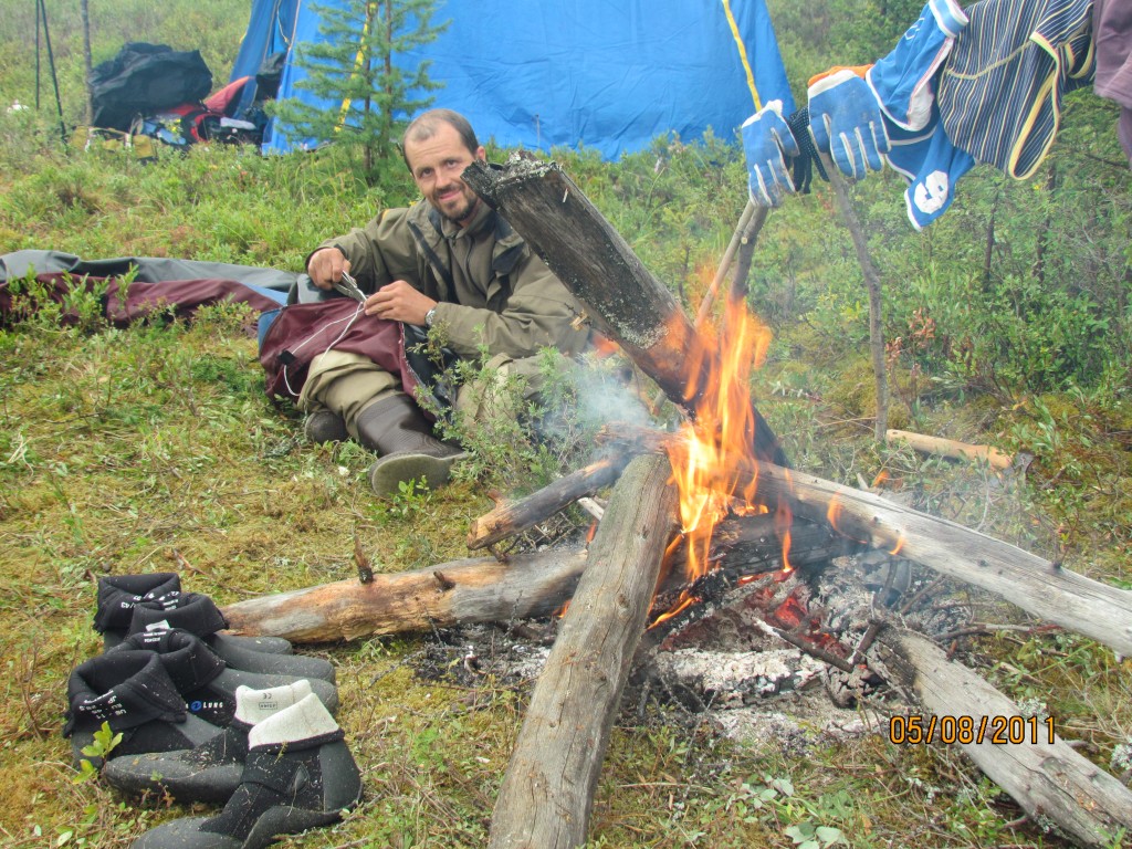 Позади потерянное на ремонт время. Впереди больше сотни километров до моста. Решили идти до упора. Холодало. Потом подмораживало. Все сырые. Это был почти упор. И тут мы увидели равнинный берег и костёр. Решили остановиться чуть ниже их.