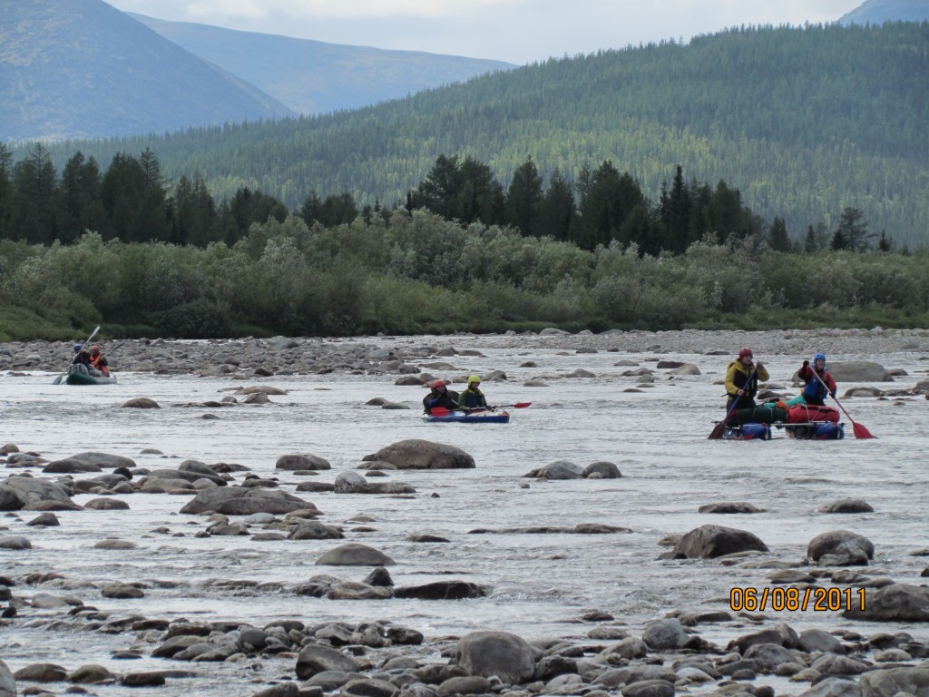 По-прежнему много волокли и таскали катамаран. Иногда плыли среди камней. Или по ним. Камни почему-то не объезжались. Какая-то асинхронная гребная схема использовалась на нашем судне. (Не успели спеться, вот как это называется. Через пару дней пели в унисон, да только песня подходила к концу. Надеюсь, в будущем наша сыгранность пригодится.) К тому же оно было основательно недокачанно, рисковать не хотелось (нитки ещё оставались, а вот целые места на пальцах закончились). И перегружено. Катамаран оказался четырёх-местный, а мы – шестиместные. Пришлось использовать иную тактику преодоления препятствий. Мы гордо неслись на них, и, если не проскакивали, а садились, то просто слазили в воду и стаскивали калошу с камня на следующий камень.