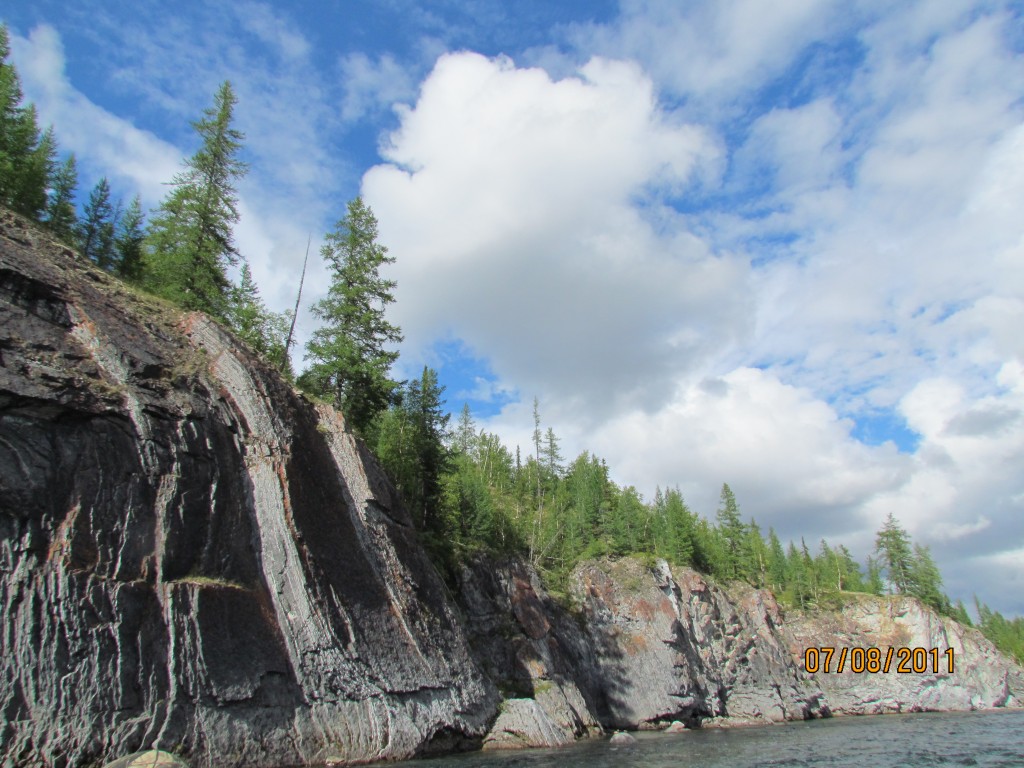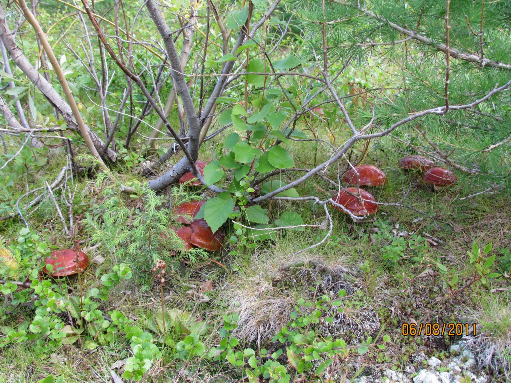 Скал дофигища! Виды с них обалденные, но в упор, на фото совсем не то, что видишь, выходит. Надо не со скал фотать, а тебя на скалах, со стороны. По берегу есть вездеходный след и пешая тропа ближе к воде. Запомнил на будущее. Всюду обилие разных ягод. Вездеходный след весь в грибах. Местное сборное название – красноголовики. И маслята и подосиновики и ещё какие-то похожие. Все не пластинчатые, а как там, губчатые, что ли. Я с грибами не очень дружу... Пока они не на сковородке.