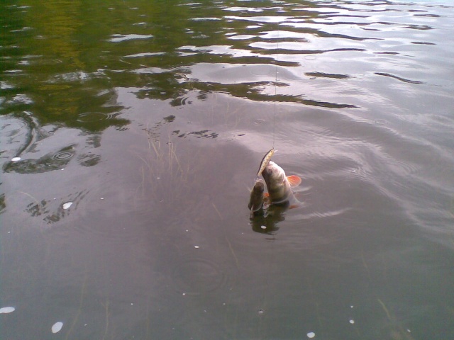 Сегодня после работы заглянул на Татьянку возле моста на подъезде к Н-ску. Человек 5 дружно кидали на одном пяточке различные железки. Только у одного средний окушок. Сначала с полчаса пытался спымать меленьким Юзуриком с заглублением 1м, но тщетно, только одна невнятная потычка. После отошёл на более мелкое место, но с песочно-щебёночным дном и прицепил дюймовый отводной полупрозрачный. И за пол часа 7 окушат спортивного размера. Более не смог проторчать, дождь только усиливался. Заглянул кстати на близлежащее озеро, где по зиме рыбачил пару раз, так вот там на воде и на траве полно мазута! Запах как на нефтеперерабатывающем заводе! Так понимаю больше здесь рыбы нету...