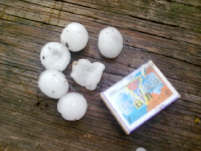 Добрый всем!Рыбалил в субботу в районе деревни Калиновка, на все что было с в ящике - 0!Но вот дальнейший поворот событий омрачил все выходные!Внезапно около часов 3 дня поднялся ТАЙФУН, будь он проклят !С градом, хоть в стакан с виски клади эти льдышки!Машине хана ибо не успел ни чего сделать! Тесть побежал накрывать машину, но получил два прямых в лоб!Размер на фото малясь меньше, поскольку уже подтаяли!