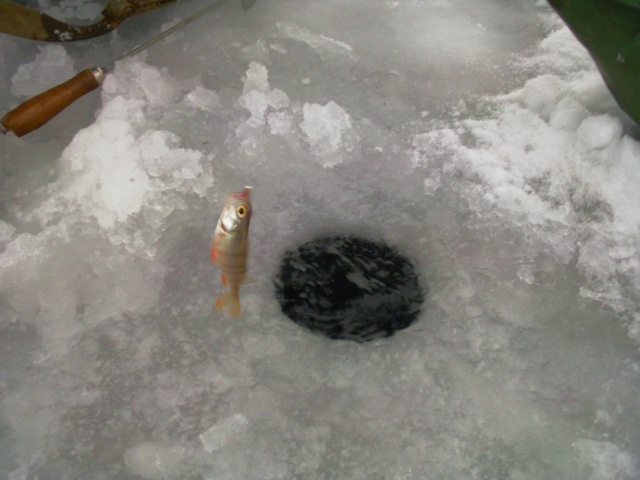 Я подбегаю,он просит помочь.Начинаю осторожно тянуть за леску.Сопротивление очень приличное.Под лункой появляется тушка окуня.800гр,не меньше это точно.Тут окунь совершает последний рывок и сваливает вместе с мормышкой.Обидно.