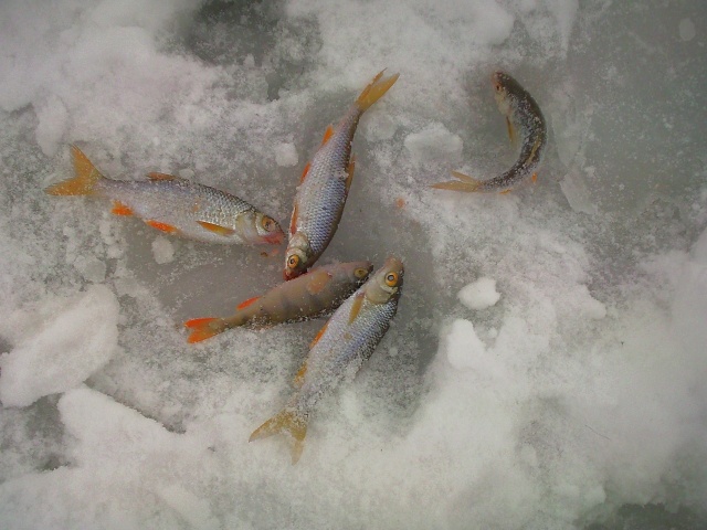 Сегодня с утра рванул в Луговое. Народу было ну просто очень много. Видел как с утра жерличники бегали. Флаги загорались часто и результативно. Часикам к 11.00 активность спала. Сам с утра ловил на блесну-бесполезно, дальше попробовал на мормышку с подсадкой мотыля. Тоже не очень. Пришлось ходить и искать. Где-то в 10.00 пробурил новую лунку и при первом спуске последовала мощная поклевка. Первый окунь и какой хороший, граммов 600-650. Дальше поклевок не было. Возвратился к тому месту откуда начинал. Здесь окунь начал брать на блесну, рамер от живцового и до 200гр. В очередной новой лунке опять хорошая хватка и окунь чуть меньше первого где-то на 500-550 гр. был вынут из речной пучины. Общий улов составил около 3-3,5 кг.