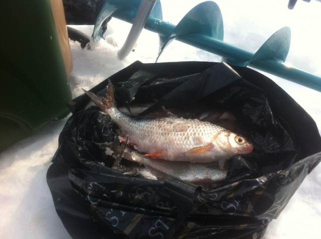 Ухожу метров на 7 вдоль берега, бурюсь, 15 минут тишины. Еще метров 10 вдоль берега. Бурюсь, глубина 2,5 метра, нащупываю дно. Начинаю играючи поднимать вверх и буквально в 5 см ото дна поклевка, густера грамм на 150. Потом еще и еще. Все поклевки около дна. Минут за 40 выловлено штук 15. Руками пытаюсь не махать, пойманную рыбу стараюсь компактно складывать около себя, дабы не привлекать к себе внимания. Ящик и мешок под рыбу остались около той самой лунки, где произошел досадный обрыв. Тем временем пойманная рыба пытается разбежаться по льду. Ну чтож, надо принести пакет. Сходил за пакетом, сложил рыбу.... и вот оно.... меня «спалили». Как потом оказалось всетаки не «спалили». Сзади меня метрах в 15-20 бурится молодой рыбачок. Но он оказался нетерпеливым и безуспеха минут через 10-15 уходит. У меня приходит временный перерыв в клеве. Спокойно наливаю чай и смотрю, что происходит рядом. Что радует, так это то, что никто ко мне не подошел и под задницей никто не бурил. Впереди меня рыбачит пожилой мужчина, он забурился практически в берег раздвинув ветки ивы и успешно «тягает» окунька вполне супового размера. Несколько позже он двинулся в мою стороны. Хочу ему сказать спасибо, его поведение заслуживает и примера и уважения. Двигаясь ко мне он пробовал рыбачить на моих лунка, и не пытался пробурится поближе ко мне. Потом подошел ко мне, мы обменялись информацией о наших успехах и он ушел дальше пытать свое рыбацкое счастье. Ловил он окунька на чертей, глубина вместе со льдом 1,5-1,2 метра.