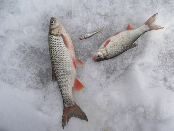 А позавчера вновь ходил на Самарку за лесхоз что за п.Горный в надежде ещё наловить голавлей, благо идти по снегу теперь было легко (кто то проехал на снегоходе). Погода за день поменялась три раза, то мороз потом ветрище и под конец снегопад. И чтоб совсем не раслаблялись господа военные начали бабахать на полигоне так что аж лёд содрагался. Итог всего один голавль грам на 500, язь, куча ершей и один премудрый пескарь))) P.S. А голавля чудом вытащил - уже стал вытаскивать его из лунки и он отцепился, я в бушлате за ним рукой, погладил его и он ушёл. Сел расстроенный и начал шумовкой лёд убирать и вижу его родного в сантиметрах 30-40, бедолага не мог развернуться в лунке, второго шанса уйти я ему не дал )))