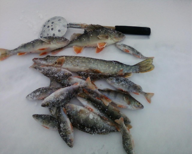 попробую, думаю... Думать как оказалося невредно совсем - уверенная поклевка и на льду окунь, прям родной брат первого. Позвонил дружбану, говорю так мол и так, не успел договорить, а он уже скрипит обувкой... Короче, кроме как на рапалу, поклевок не было ни на что. Итог- к 14-00 у меня около 4 кг окуня, весь 300-350 дружбана поболе. Полосатых подростков, чтук 20 отпустили подрастать. День прелесть, погода пофиг. Удовольствие неописуемое. На обратно пути, правда пришлось потолкать нашу Ниву.... потеплело, снег стал как пластилин, колея обмякла... Всем удачи!