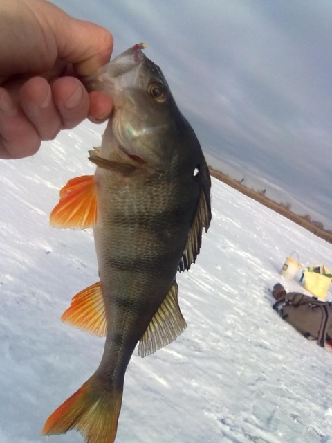 После митинга решил отправиться на рыбалку, на одно озерцо. лед был около 20см, рыбалил на мотыля. Бродил по чужим лункам, у берега пробовал пусто, мой товарищ решил пройтись вдоль берега у него просто по нулям было, ни поклевки. Я ушел ближе к середине и тут началось. Смотрю кивок начал подниматься