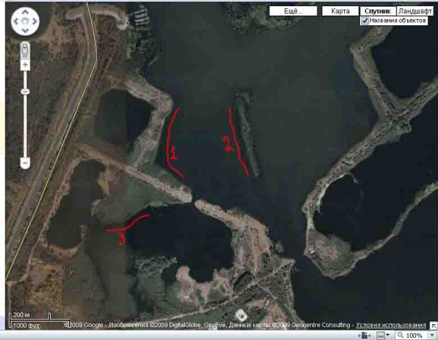 №2-это окунь.№1-Это окуньМежду №1 и №2 есть протока, узкая такая протока-это щука, не много но приличная. №3 и окунь и щука но мелко, очень мелко, бери запасной коплект ножей и готовь ноги к тренировке.