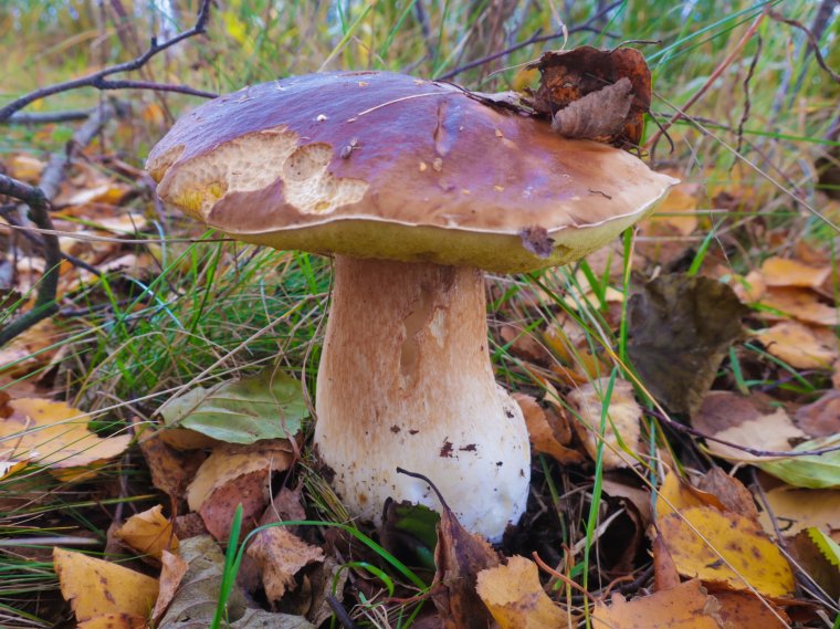 Получив огромное удовольствие и завершая рыбалку, на берегу у березы заметил одинокий белый гриб.