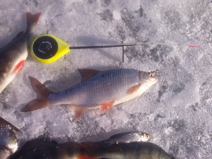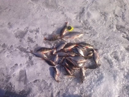 Всем привет.Так как вчера клевать начало в 17ч,то и пришел я к б/о Россия к 17ч.Опустил в лунку балансирчик, подергиваю,тишина вдруг поклевка,подсекаю и.......обрыв,беру другой балансирчик, подергиваю, потычка,подсечка, мимо и тишина,время 17.30 а уменя 0 беру мормышку подсаживаю тюльку и 5 поклевок подряд и 5голавликов на льду потом тишина,перехожу на другую лунку и еще 4 голавлика,итог 9 голов,самый большой 1.3кг. общий вес 6.4кг.
