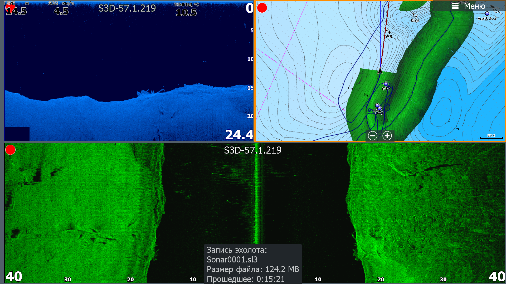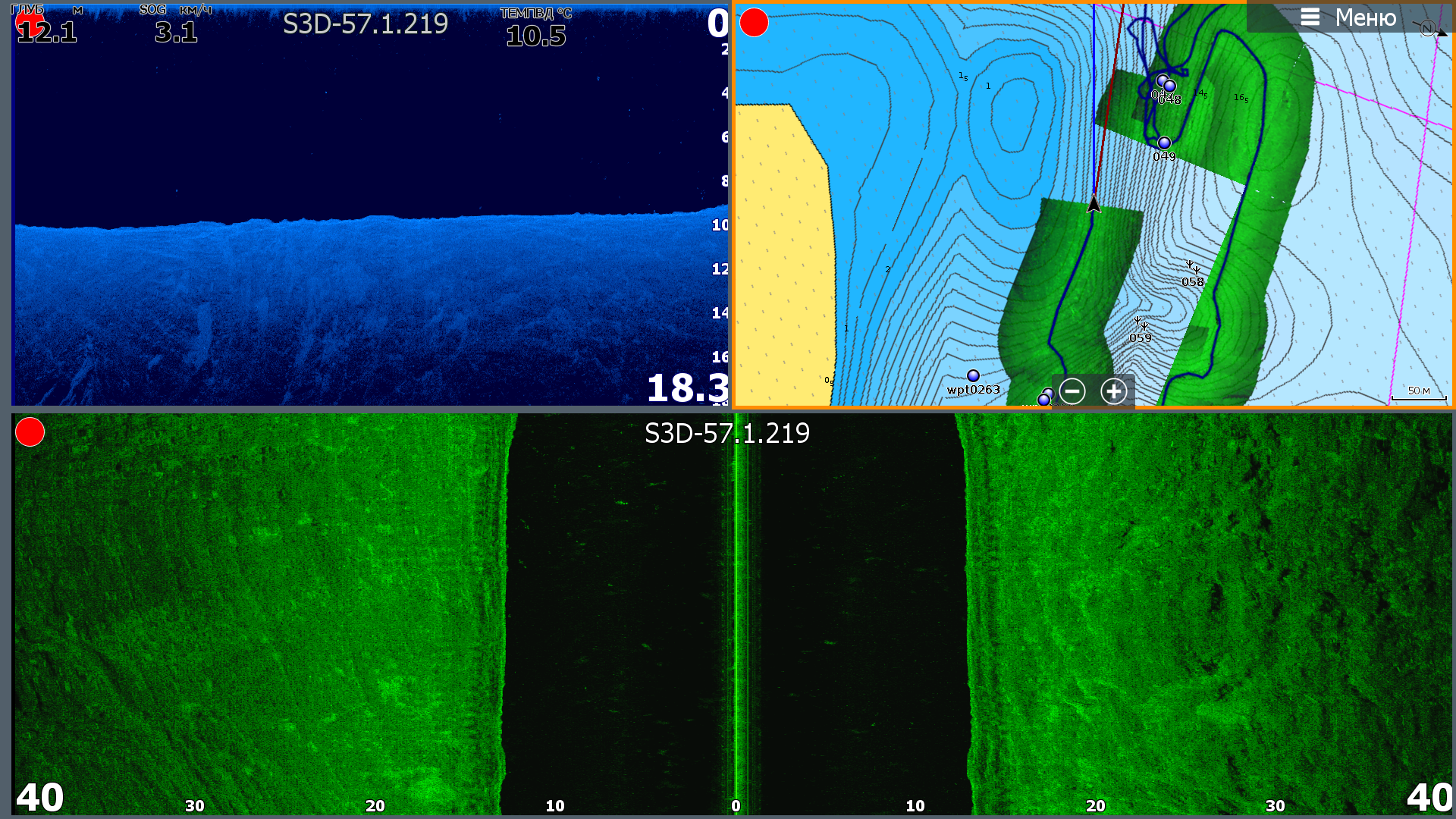 5. Все режимы структурника, в том числе SS3D, теперь доступны одновременно! Это крайне полезная фича! Боковики делим на левый-правый, одно окно на нижний сканер и одно на 3D или карту. Ну или другие комбинации. К сожалению только 4 окна. Вероятно нехватает производительности. При выводе 4 окон с датчика SS3D в режиме имитации с записанного лога, Carbon 12 в окне 3D немного подтормаживал у меня. На Live такого нет.