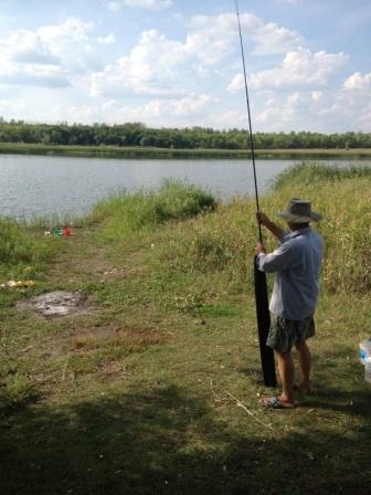 Тут проснулся Диман, вылез из тачки и как раз поклевка. Выудили карася на пару с Димой (он подсаком орудовал ). Потом еще и еще. Коллега тоже споймал 4 штуки: 2 зеркальных карпенков и 2 карася не хилых, после чего уехал домой. Димон освоил технику заброса почти с первого раза. Помню когда я учился, то дальше 3-4 метров от моих ног донки не летели