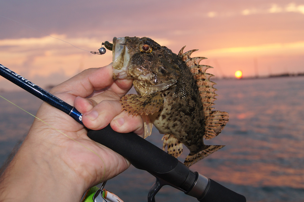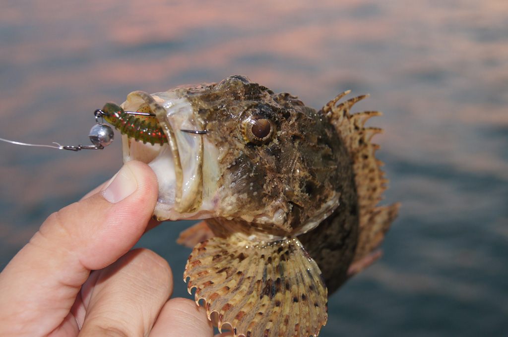 Приступаю к новинкам. Забрасываю ZX-30. Касание дна, начинаю проводку. Джиговую ступеньку. Приманка даёт очень мощные колебания, постукивая по камням. При этом, устройство приманки, делает ZX настоящим внедорожником. Пробую обычную проводку Stop&Go, ZX исправно «отстукивает» о состоянии морского дна. Тук-Тук-Тук.. Опа! Есть контакт! Наверное, первая в России скорпена, пойманная на эту приманку! Если и не первая, тоже хорошо!