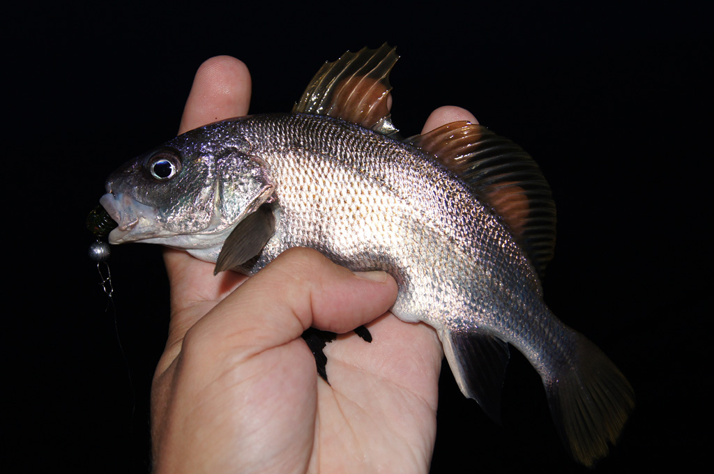 Начало в 21-00. Пока приноравливался к "резине" и отрабатыванию подсечек, так как поклевку чувствуеш раньше чем рыба приманку в рот засосала(шутка), стемнело. На очередной проводке уверенный тычек, подсечка и нано горбыль на крючке. Фото сессия, рыба плывет обратно к папе и маме.