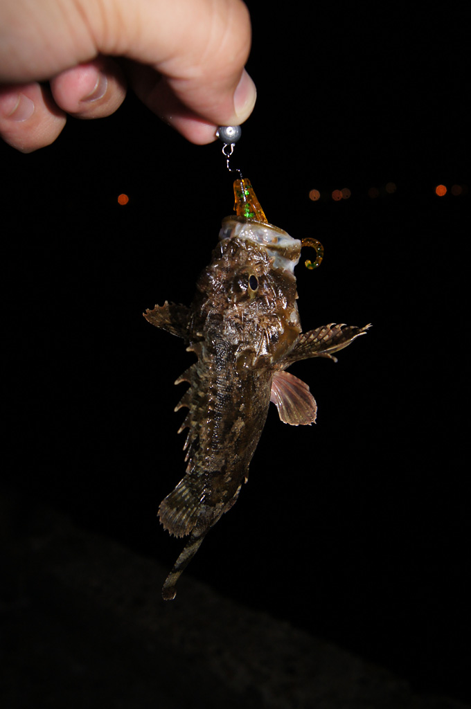 Надо отметить, что погода была не самая хорошая для морской рыбалки – достаточно сильный северо-восточный ветер. Забрасывать комфортно, а вот, рыба, как правило, при таком ветре капризничает. Так оно и было. Поклёвки редкие. «За кончик губы». Сооружаю отводной поводок с грузом – тирольскя палочка. На конце поводка - обычный крючок с необычным червяком. Это червь Power Isome. Насаживать можно как настоящего червя. Медленная проводка. Поклёвка! И скорпенка на берегу. Фото на память.