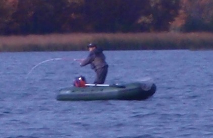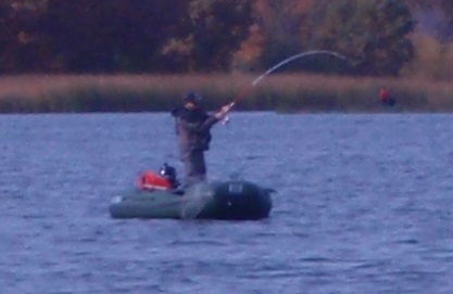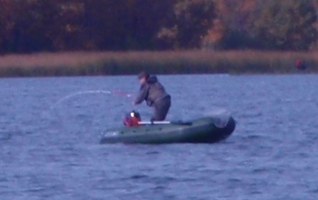 Потом происходит поклёвка ещё одного монстрика,но этот явно поменьше,подвожу его к лодке,он на поверхности,ну примерно прикинул его вес - кила на 1.5 потянет наверное.Уже взял подсачек,начинаю заводить туда окуня и в этот момент он сходит.Опять выругался и продолжил ловлю