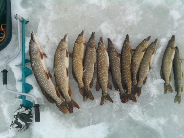 Через полчаса ещё одна поклёвка и уже щуку на 5 кг подвёл к лунке с третьего раза.