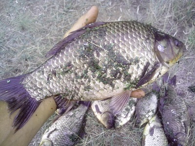 Сегодня, Волга. Жара дает о себе знать. По ходу до места рыбалки увидел почти весь видовой состав волжской рыбы в виде плавающего дохляка - и судак, и окунь, лещ и даже щука