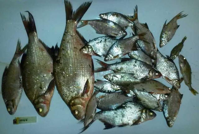 Утром рано мощный удар по фидеру. Вытягиваю леща (или подлещика). Не дотянул до кило ровно двадцать грамм. 980 гр. показали весы... На одной фото садок с рыбой с места ловли(увы, ракурс получился плохой), и общий улов крупным планом так сказать...