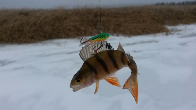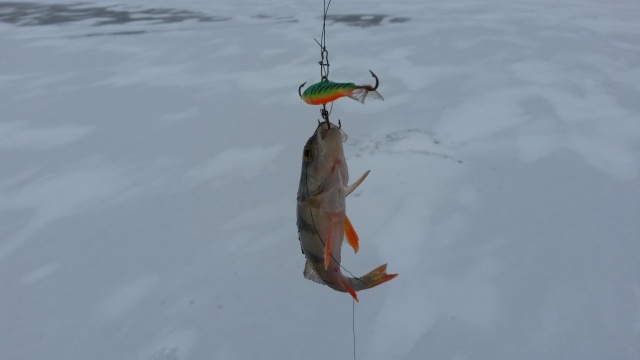 Что то нет отчетов о рыбалке,или испугались погоды?Ну а мы дураки,парни не глупые,поперлись.Сначала хотели ехать на новое место,но поразмыслив оставшимися мозгами,решили что в такую погоду можем и не вернуться,поехали туда откуда можем вернуться.Настроение было не очень,т.к. в этом месте мы раньше здорово щуку проредили.Нужны были новые неизведанные и не избуренные места.Друг как всегда на жерлицы,а я решил что буду упорно ловить на ратлин.Бурил много и упорно дергал ратлин.Дергал по всякому,но успехов он мне не принес.У друга уже 3 флага,у меня только пот и куча снега на мне,который не очень то хотел с меня слетать.Плюнул я на этот ратлин и поставил проверенный балансир 7 см.китайского производства.Ну и немного дело пошло.