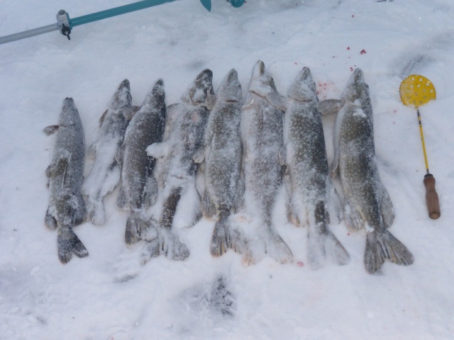 Санёк(Green_Go) упражнялся с жерлицами, 8 флагов, 0 щук. Только две засеклись, но сошли под лункой. Мы с Саньком(Sam86) дырявили лёд и купали балансиры. Клевал только мелкий окунёк.