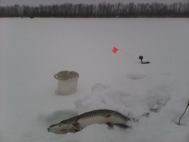 Часов в 9.00 первый флаг. Хороший бой подо льдом и откусанный крючок. Через минут 20 несколько флагов холостых, потом опять откусанный крючочек. Меняю поводки из флюра на вольфрамовые и тишина... Меняю обратно на флюр, оставив на трех вольфрамовые и минут через 10 первая красавица на льду