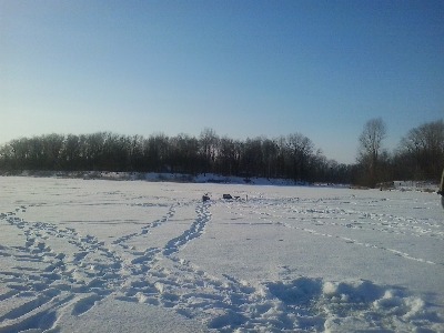 , аж 5 палаток, как сели на одно место, так и просидели весь день! Глубина около 6 метров, по эхолоту 5,7 м, рыбка есть в эхолоте, даже поклевки были, одну типа по губам и кормили и так и сяк, а она ну ни как на мороз не хотела. В итоге в 16,00 собрались и до дому. Что порадоксально, все в сетках, вся река в кустах, как будто среди мелкого леса ловили, или на заливных лугах.